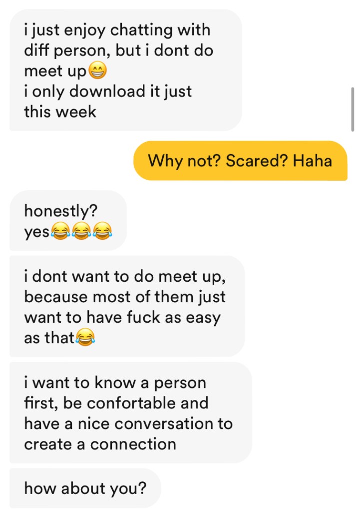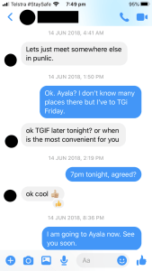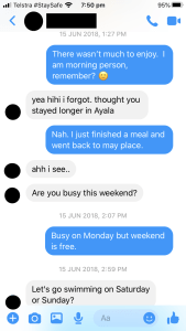 I shot her my selfie from TGI Friday’s for identification purposes. And here the bullshit started. She had definitely arrived at the mall but she was “too shy” to meet a foreigner. As you can see, I was sitting at the cafe for more than 20 minutes like a tool before she delivered that. What kind of sorcery is that? Is she really shy? Haven’t she met a foreigner before? Kinda plausible, right? Wrong. It was all bullshit, as I will explain later.