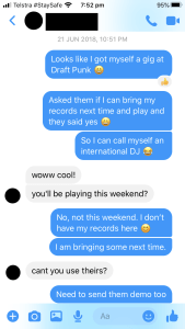 We went for two rounds before she left. That was the last time I saw her. She didn’t reply to my feelers and, as we kept connected on Instagram, I learned that withing the next month she got herself a boyfriend (incidentally also an amateur DJ) and they moved together to live in a small town in Central Coast.